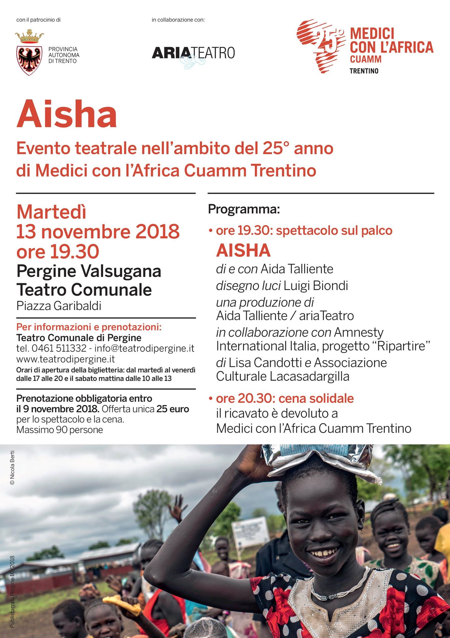 Martedì 13 Novembre 2018 presso il  Teatro Comunale di Pergine Valsugana in collaborazione con Aria Teatro si terrà un Evento teatrale dal titolo AISHA. Lo spettacolo si svolge nell’ambito del 25° anno di Medici con l’Africa Cuamm Trentino e sarà seguito da una CENA SOLIDALE il cui ricavato sarà devoluto al Cuamm Trentino.